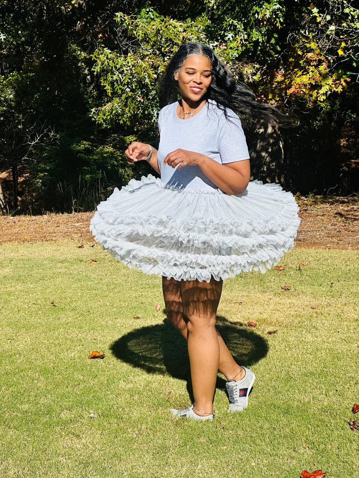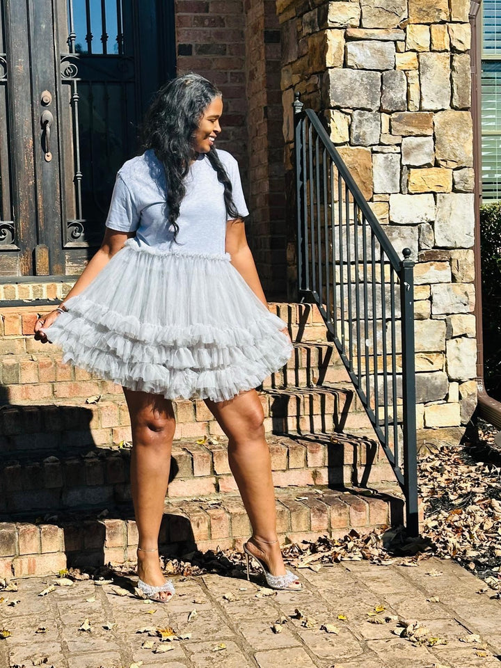 This T-shirt dress is a playful blend of casual and chic featuring a classic heather grey tshirt top with a full layered tulle bottom. Perfect for brunch, day party or anywhere you want to stand out with style. Model is 5’10 wearing a medium.