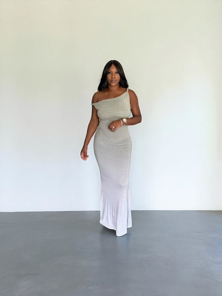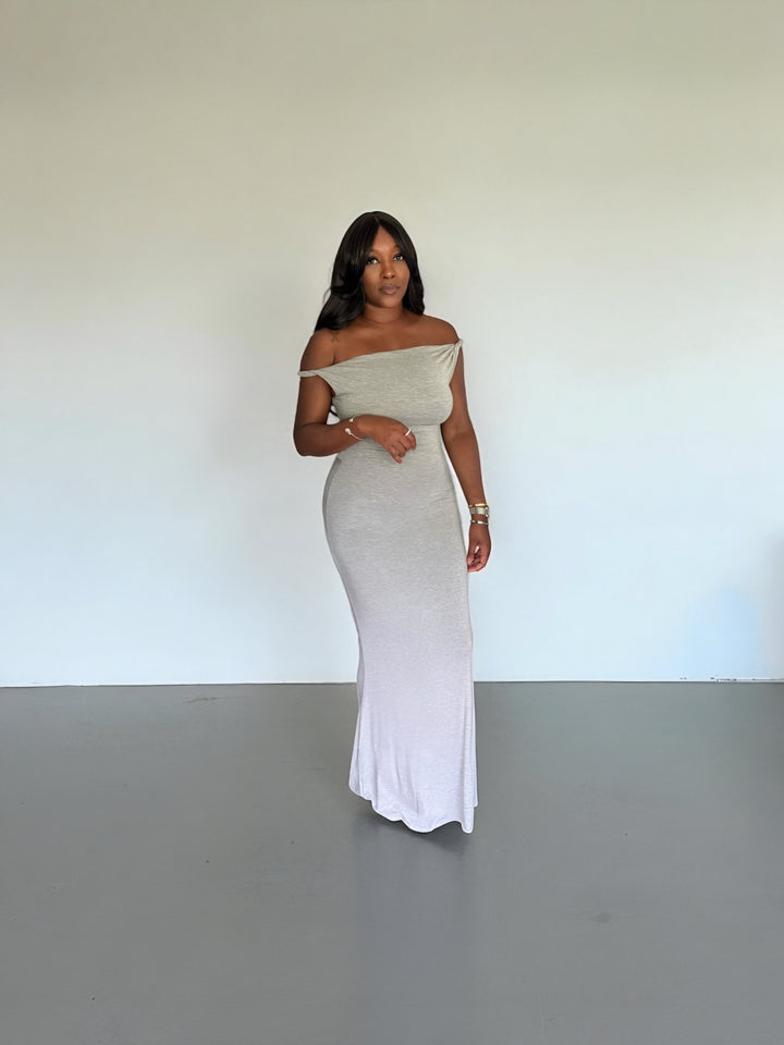 Effortless Grace In Every Step In This Twisted Shoulder Fitted Maxi Dress. Straps Can Be Worn On Or Off Shoulders. True to size with lots of stretch. Model is wearing a small.