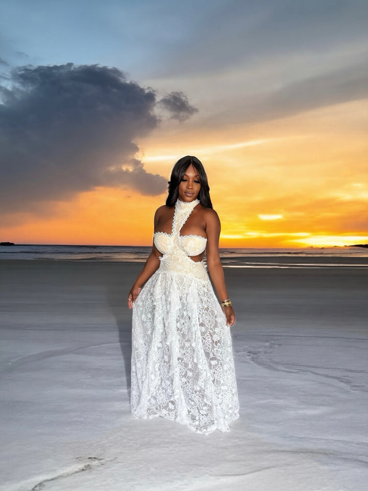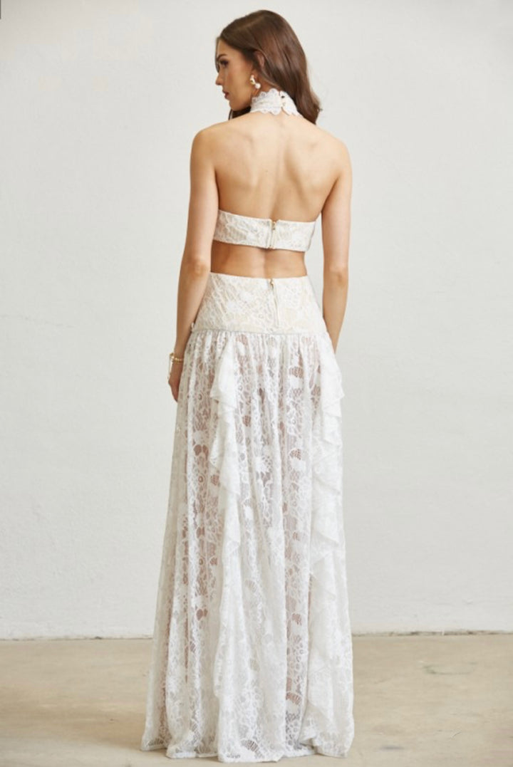 Be Forever That Girl In This Floral Embroidered Beige And White Lace Dress Featuring A Halter Neck Buttoned Closure, Dainty Crochet Detailing, Cutout Waist, Padded Cups With Underwire, Ruffled Skirt Front & Back (SHEER), Attached Panty Underlay, Flowy Hem And Back Zipper Closure. True To Size. Model is wearing a small.