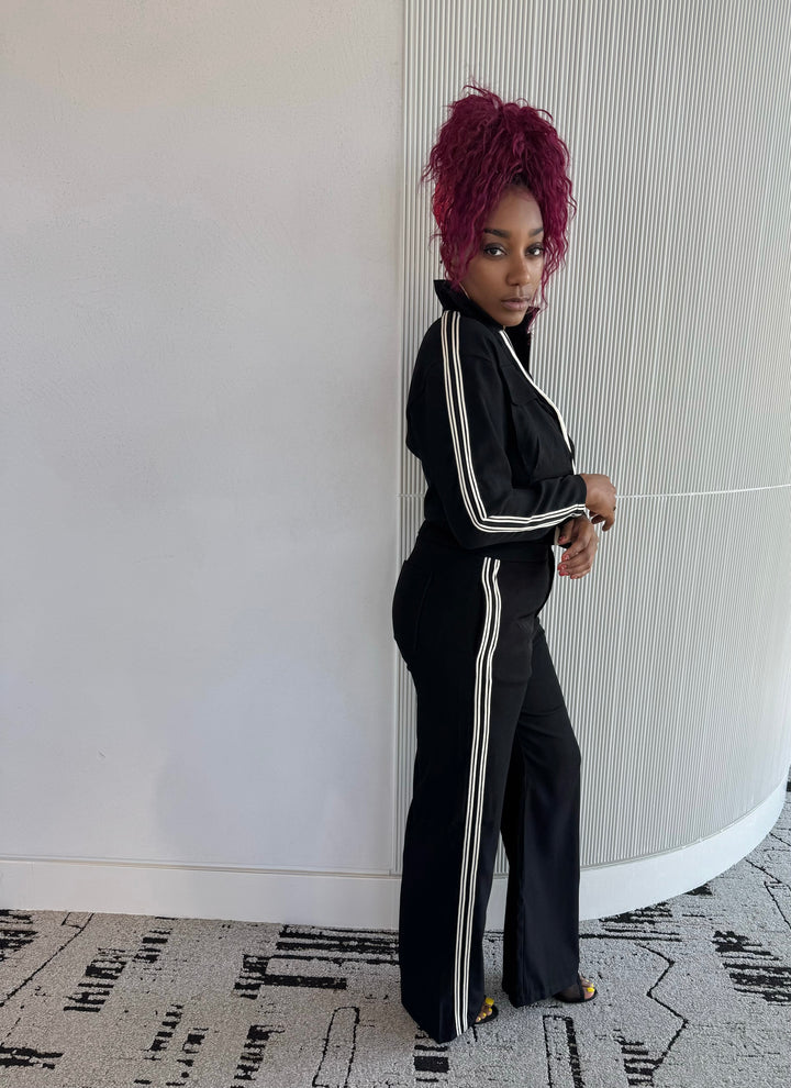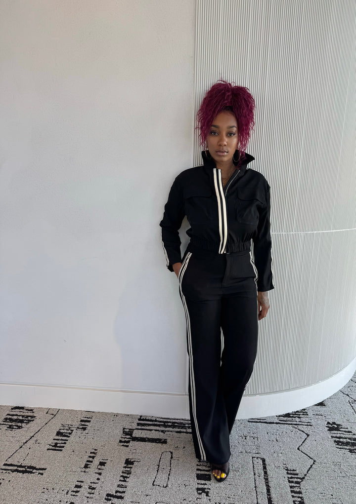 Add This Sleek, Confident And Sporty Luxe Vibe To Your Wardrobe Featuring A Black Two Piece Set Featuring White Stripe Detail Along The Sides, Zip Up Front With A Striped Cover Detail And High Elastic Waist Button Closure Pants With Side And Back Pockets. True to size with good stretch. Tall girl friendly. Model is wearing a small.