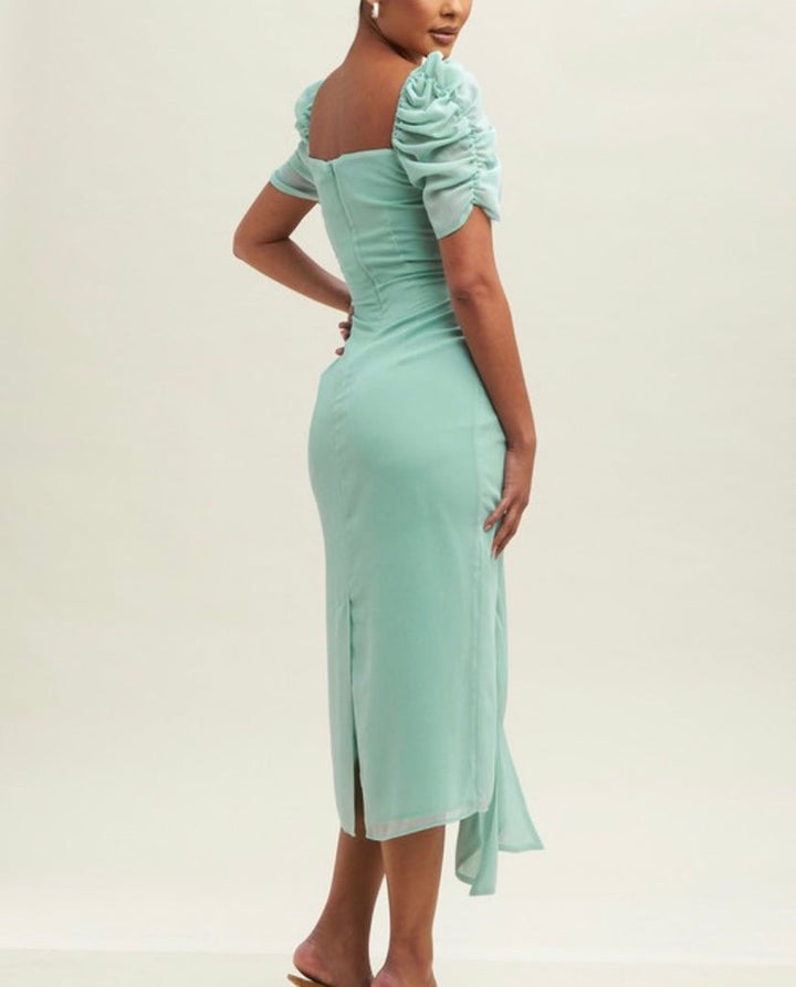 Dusty Mint Tie Front Draped Midi Dress With Invisible Back Zipper, Cut Out Front And Short Ruched Sleeves. True to size. Model is wearing small.
