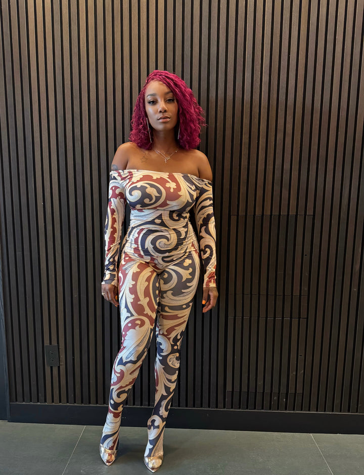 Step Out Like A Masterpiece In This Off Shoulder Bold Paisley Print Jumpsuit. Lots of stretch. Model is wearing a small.
